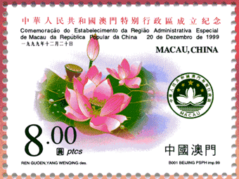 たくさん、あります。じつに意外なことです。マカオは現在、中国の特別行政区であり、その面積はわずか27平方q、人口は57万人です。そんな場所で、蓮の切手など? と思う人がいたとしても無理からぬことです。 事実は小説よりも…です。わが手元には、マカオ発行の蓮花の図柄の切手が8枚、蓮花の初日カバー一枚、特別行政区成立記念の蓮花の大型リーフレット一枚などがあるのです! それぞれの切手には、特徴と意義があるのですが、やはり「ポルトガルの植民地を脱し」「祖国に帰還した」1999年12月20日発行の切手を選びました(下)。ちなみに切手の右側にある緑色の紋章は、特別行政区マカオの区章です。蓮にかけるマカオの人たちの想いが、そこに具象化されています。 |