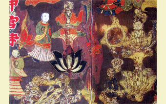 | います。その図様はじつに多彩です。仏像・神将・僧侶・庶民などが描かれいるほか、鳳凰・兎・飛雲・唐草・蓮文様などがあります。蓮図は現在、かなり黒く見えますが、本来は青糸で刺繍された青蓮花のはずです。ここでの蓮は、死後、極楽世界に往生することを願った人が、蓮の花の中に生を受けるという蓮華化生を表しています(K)。 | |||||
